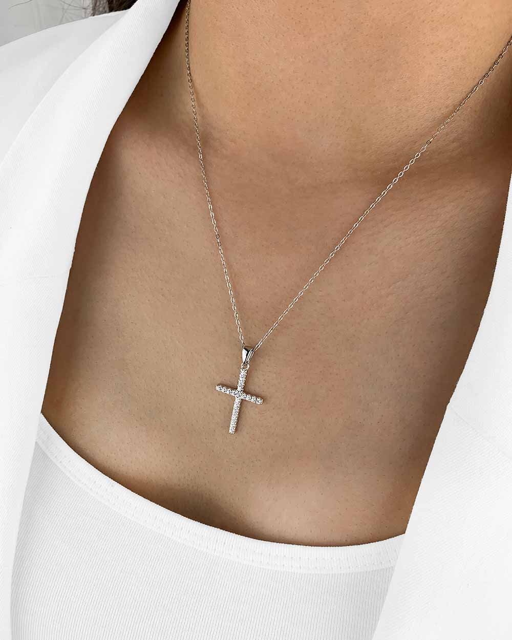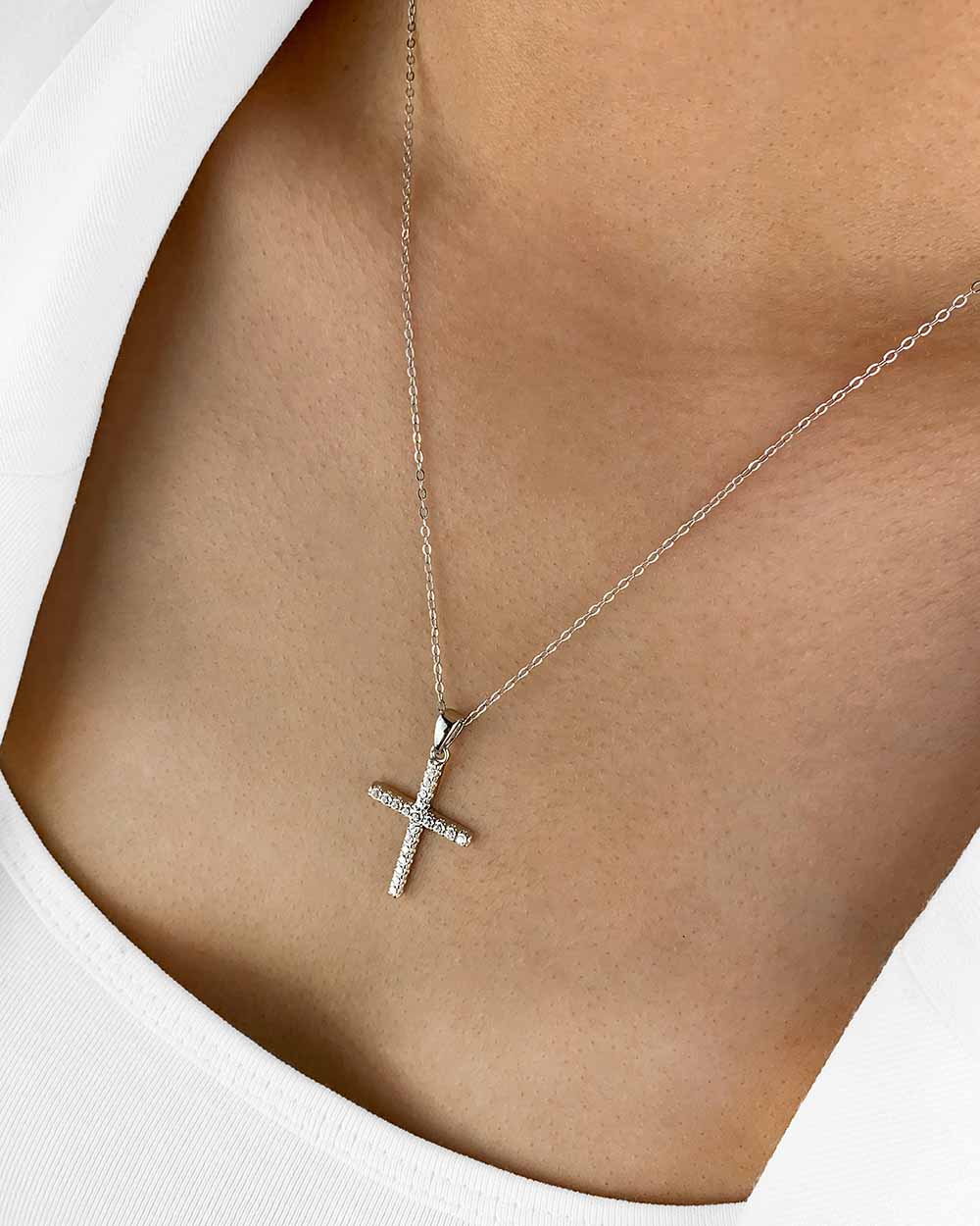 Die glanzvolle Kreuzkette Christabel besteht aus feinstem 925er Silber, funkelnden Zirkonia Kristallen und einer hochwertigen Schutzschicht aus echtem Rhodium. Der elegante Kreuzanhänger begeistert durch das minimalistische und zugleich edle Design und die hochwertige Verarbeitung. Er vereint symbolische Tiefe mit zeitloser Schönheit und ist der ideale Begleiter für den Alltag. Die anlaufgeschützte Silberkette ist größenverstellbar mit einer Kettenlänge von 40cm bis 45cm und bietet langanhaltende Freude sowie höchsten Tragekomfort. In einer edlen Verpackung geliefert – perfekt als bedeutungsvolles Geschenk für einen besonderen Menschen oder als stilvolles Accessoire für jeden Anlass.