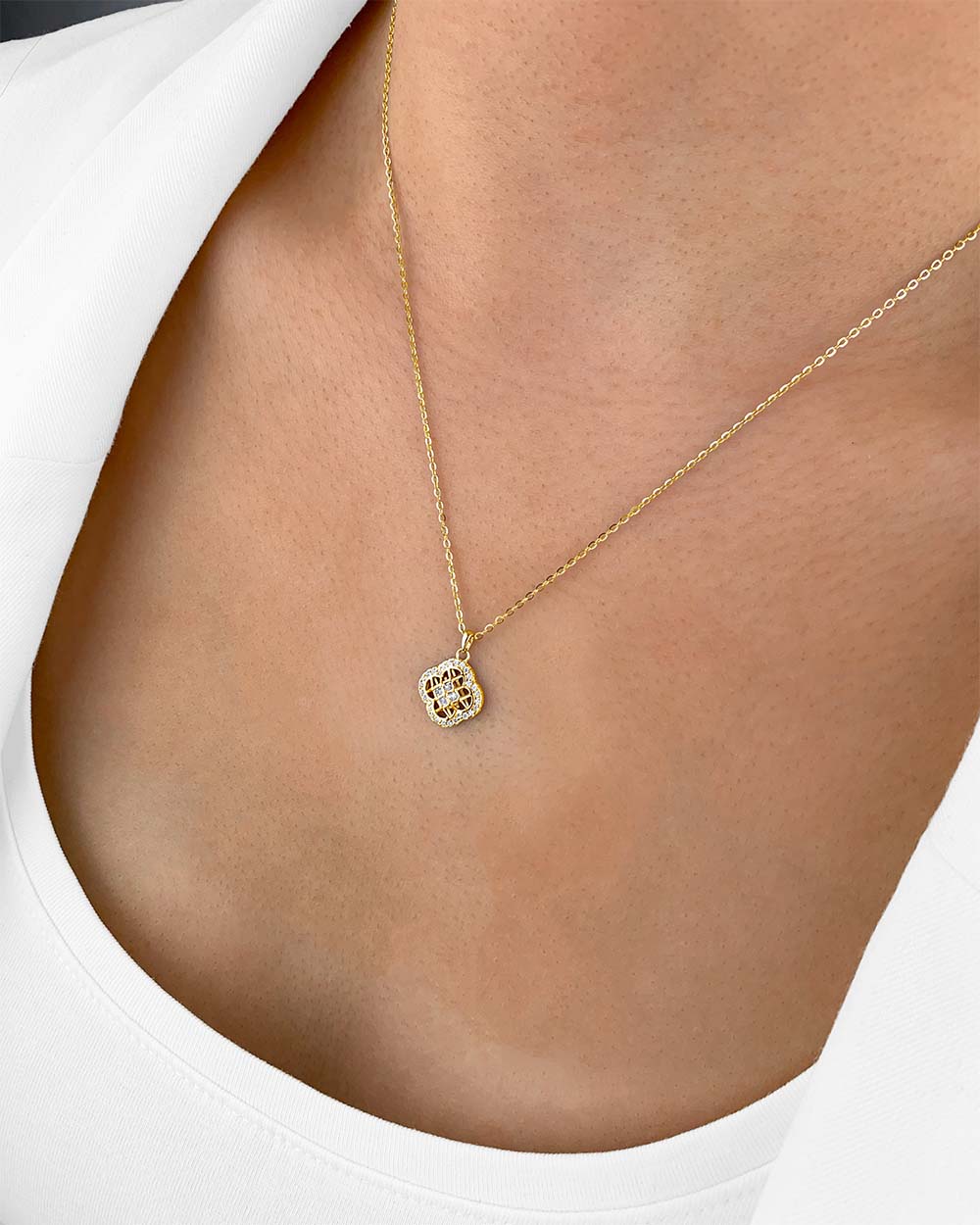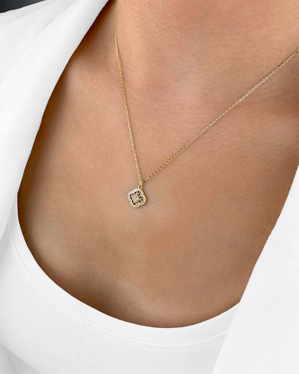 Die elegante Halskette Mirabelle besteht aus feinstem 925 Sterlingsilber und funkelnden Zirkonia Kristallen. Der grazile Anhänger mit vier abgerundeten Bögen hat die symmetrische Form eines Vierpasses und symbolisiert Harmonie und Vollkommenheit. Das filigran gearbeitete Gittermuster im Inneren und die leuchtenden Kristalle machen dieses Schmuckstück zu einem stilvollen Blickfänger und dem perfekten Accessoire um dezent aufzufallen. Die rhodinierte Silberkette ist größenverstellbar mit einer Kettenlänge von 40cm bis 45cm und bietet langanhaltende Freude sowie höchsten Tragekomfort. In einer edlen Verpackung geliefert – das perfekte Geschenk für Deine Liebsten.