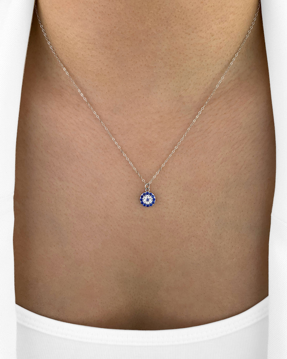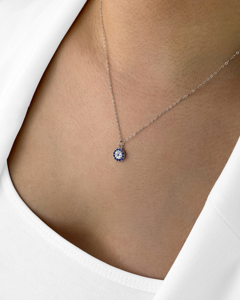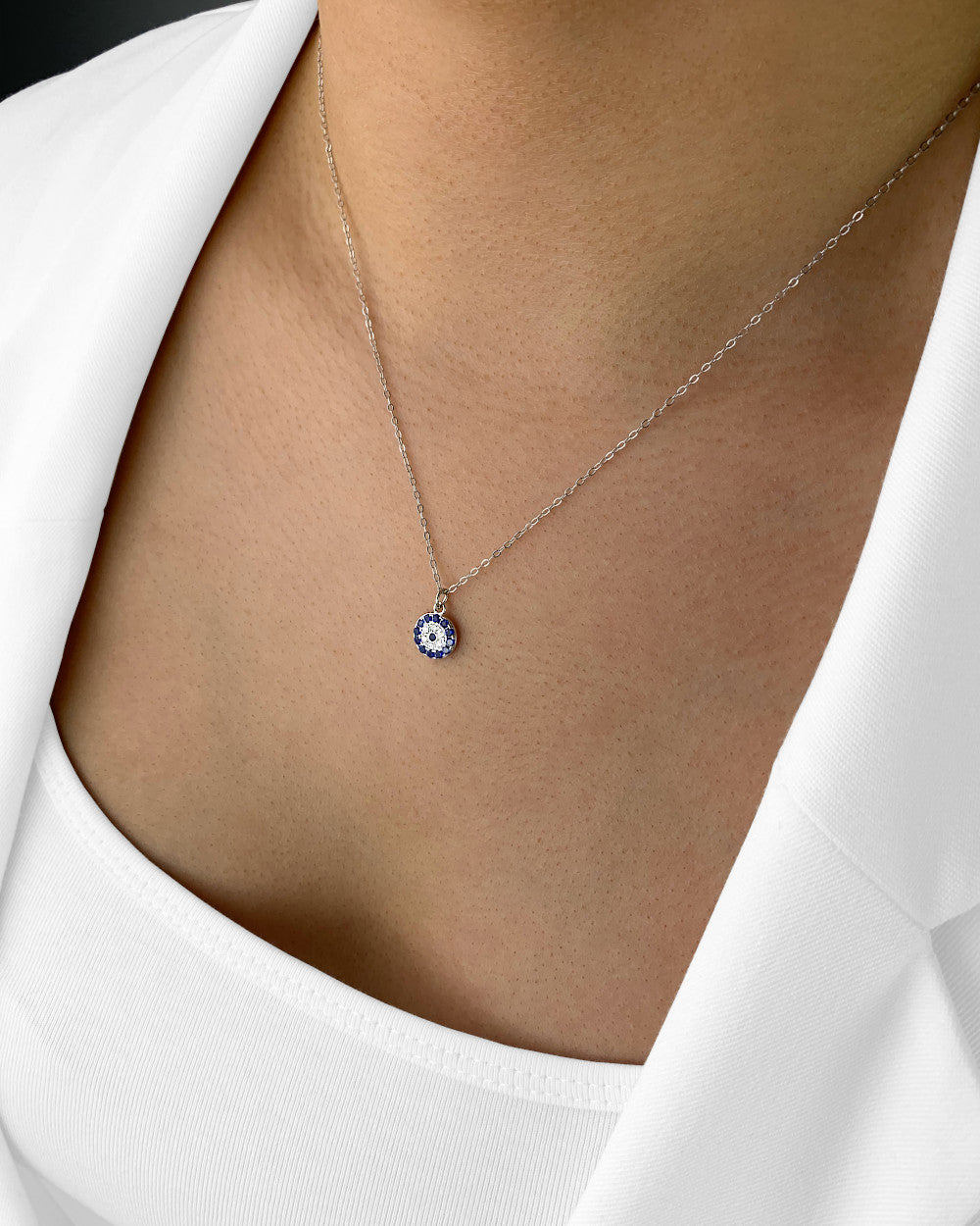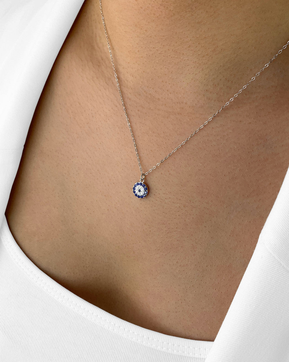 Die stilvolle Halskette Nila besteht aus feinstem 925 Sterlingsilber und funkelnden Zirkonia Kristallen. Der filigrane Nazar-Anhänger aus Sterlingsilber ist ein echter Blickfänger und gibt deinem Outfit eine ganz besondere Ausstrahlung. Er begeistert durch die filigrane Verarbeitung sowie das modische und zugleich traditionelle Design. Die rhodinierte Silberkette ist größenverstellbar und hat eine Kettenlänge von 40cm - 45cm. Sie bietet langanhaltende Freude sowie höchsten Tragekomfort. In einer edlen Verpackung geliefert – das perfekte Geschenk für Deine Liebsten.
